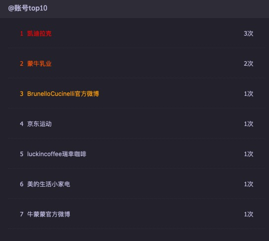 2、根據(jù)時趣洞察引擎對于谷愛凌的微博相關(guān)話題進行檢索分析,與谷愛凌微博互動量排名靠前的品牌賬號,分別有凱迪拉克、蒙牛、Brunello Cucinelli、京東運動、瑞幸咖啡、美的等。