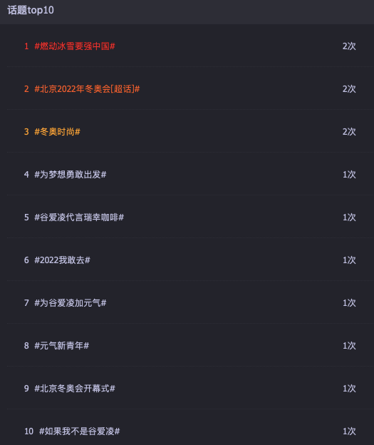 1、根據(jù)時趣洞察引擎對于谷愛凌的微博相關(guān)話題進行檢索分析,可以看到話題top10中,除了冬奧會相關(guān)的話題,也不少品牌話題上榜,比如#谷愛凌代言瑞幸咖啡#、#元氣新青年#(元氣森林代言)等社交熱度表現(xiàn)不錯。