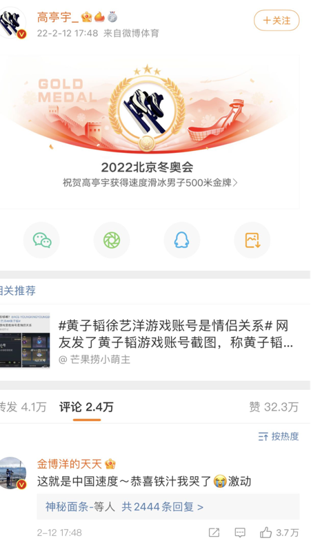在高亭宇拿下速度滑冰男子500米金牌后,微博就在高亭宇自動(dòng)發(fā)布了相關(guān)微博,花滑選手金博洋評(píng)論道“這就是中國(guó)速度~恭喜鐵汁我哭了,激動(dòng)”。