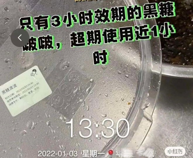 根據(jù)該博主提供的照片顯示,一款早上10點(diǎn)過期的草莓凍,一直被用到了下午2點(diǎn)多;另外一款只有3小時(shí)時(shí)效期的黑糖波波,超期使用接近1個(gè)小時(shí)。