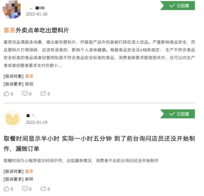 作為茶飲品牌,食品安全問題也是行業(yè)一大隱憂。黑貓投訴顯示最近兩條是關(guān)于在喜茶外賣吃出塑料片,以及取餐時(shí)間過長的投訴。