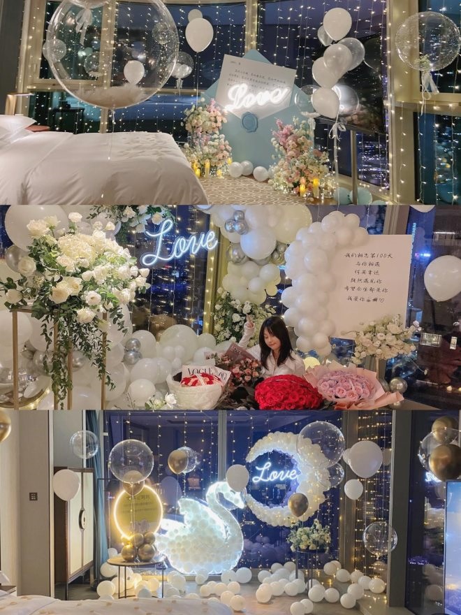 準(zhǔn)備和女友求婚的00后小顏,也選擇了花3500元請(qǐng)人在酒店房間里做以氣球?yàn)橹鞯膱鼍安贾。地點(diǎn)選在了廣州天河一家五星級(jí)酒店的高層房間,大大的落地窗望出去是繁華熱鬧的城市夜景。