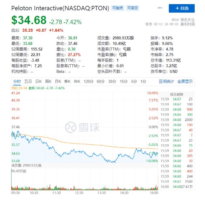 這在Peloton股價上體現(xiàn)得淋漓盡致。經(jīng)歷了瘋狂的2020年后,Peloton股價在2021年一路震蕩下跌,最新報價34.68美元/股,相較于曾經(jīng)的高點155.52美元/股,跌幅超75%。最瘋狂的時候,Peloton市值高達(dá)500億美元,如今已經(jīng)蒸發(fā)了近400億美元(約合人民幣2500億元),令人唏噓。
