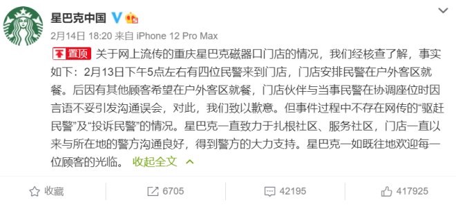 針對此事,2月14日晚間,星巴克致歉并回應(yīng)稱,涉事門店為重慶星巴克磁器口門店,事發(fā)當(dāng)日門店曾安排民警在戶外客區(qū)就餐,后因有其他顧客希望在戶外客區(qū)就餐,門店員工與當(dāng)事民警在協(xié)調(diào)座位時因言語不妥引發(fā)溝通誤會。對于網(wǎng)傳的“驅(qū)趕民警”及“投訴民警”的情況,星巴克方面表示否認(rèn)。