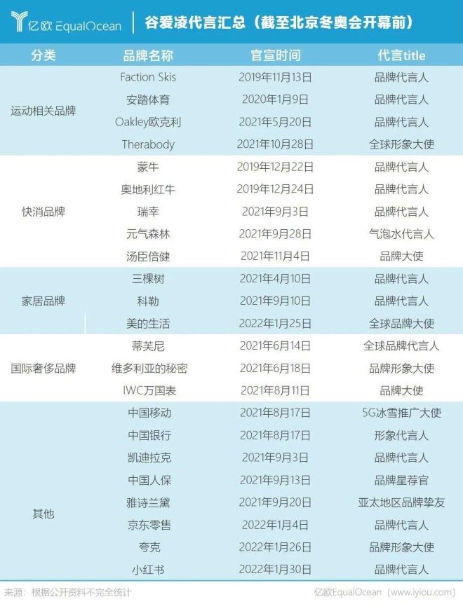 據(jù)億歐EqualOcean不完全統(tǒng)計,截至北京冬奧會開幕前,公開宣布谷愛凌為代言人或大使的品牌有23個。