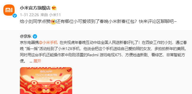 一個(gè)是在春晚當(dāng)天,增加發(fā)紅包的輪次。此前,快手10億(現(xiàn)金紅包)發(fā)了4輪,百度9億(現(xiàn)金紅包)發(fā)4輪,這次京東的15億(紅包加實(shí)物)發(fā)了7輪。這樣做的好處可能就是“泄洪”。