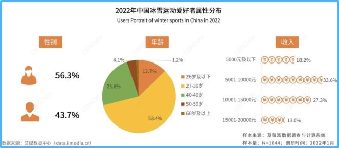 這個(gè)數(shù)字與艾媒咨詢(xún)的調(diào)研結(jié)果基本相當(dāng)。艾媒咨詢(xún)發(fā)布的《2022年中國(guó)冰雪運(yùn)動(dòng)行業(yè)發(fā)展趨勢(shì)報(bào)告》顯示,2022年中國(guó)冰雪運(yùn)動(dòng)群體主要以青年人為主,其中27-39歲的冰雪運(yùn)動(dòng)愛(ài)好者占比為58.4%,位列各年齡層首位。