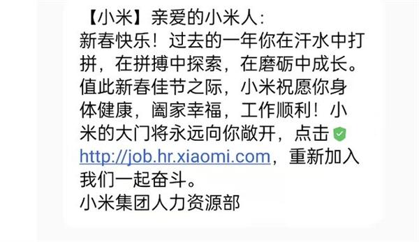 同時,此前小米的離職老員工近日還收到短信消息稱小米的大門永遠(yuǎn)敞開,歡迎重新加入小米一起奮斗。