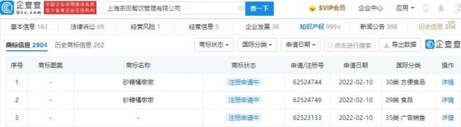 企查查APP顯示,近日,茶飲品牌“樂樂茶”關(guān)聯(lián)公司上海茶田餐飲管理有限公司新增多項(xiàng)“砂糖橘墩墩”商標(biāo)申請(qǐng)信息,國(guó)際分類涉及方便食品等,目前商標(biāo)狀態(tài)均為“注冊(cè)申請(qǐng)中”。