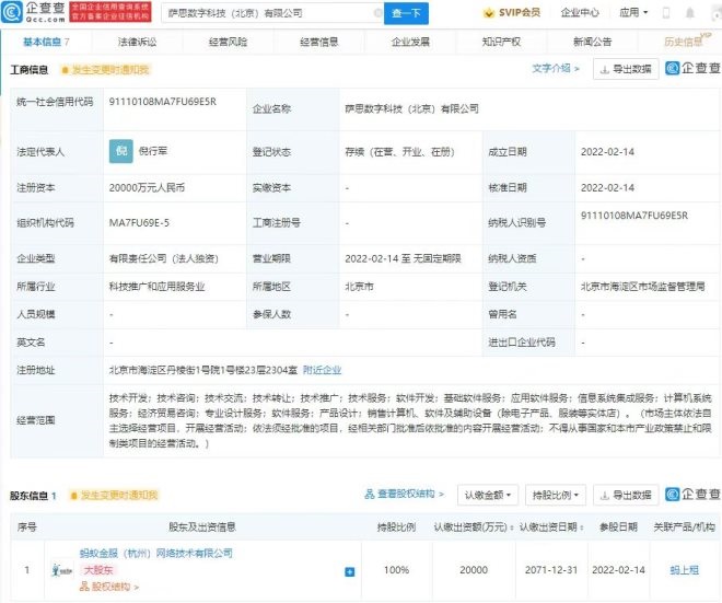 2月15日,企查查信息顯示,薩思數(shù)字科技(北京)有限公司成立。