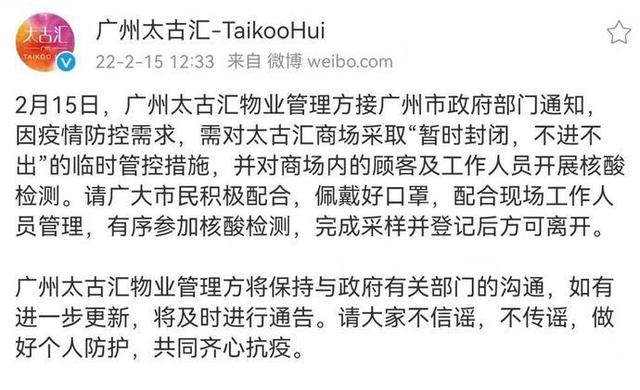 2月15日,廣州太古匯在其官方微博發(fā)布消息稱,因疫情防控需要,商場(chǎng)暫時(shí)封閉,不進(jìn)不出。
