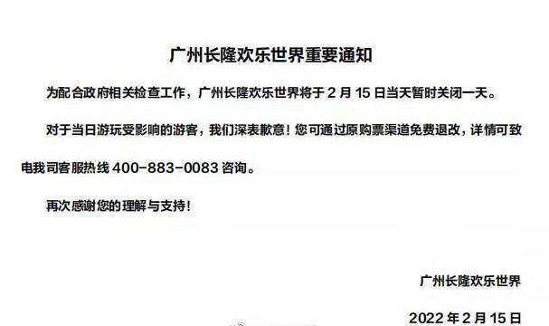 與此同時(shí),2月15日,長(zhǎng)隆歡樂世界發(fā)布重要通知,為配合政府疫情防控工作,廣州長(zhǎng)隆歡樂世界將于當(dāng)天暫時(shí)關(guān)閉一天。對(duì)于當(dāng)日游玩受影響的游客,長(zhǎng)隆深表歉意,并可提供免費(fèi)退改。