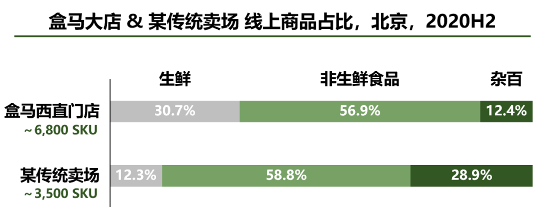 圖9:盒馬大店VS傳統(tǒng)賣(mài)場(chǎng),線上SKU占比,2020H2