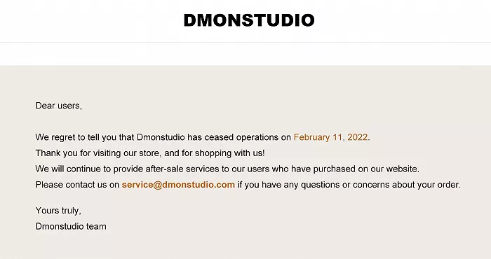 2022年2月14日,知情人士向媒體爆料稱,字節(jié)跳動(dòng)已關(guān)閉服裝獨(dú)立站 Dmonstudio,從其官網(wǎng)發(fā)布的網(wǎng)站運(yùn)營(yíng)關(guān)停公告看,其并未就關(guān)停原因作出解釋,但表示會(huì)為消費(fèi)者在網(wǎng)站上購(gòu)買的產(chǎn)品繼續(xù)提供售后服務(wù),具體關(guān)閉日期是2022年2月11日。