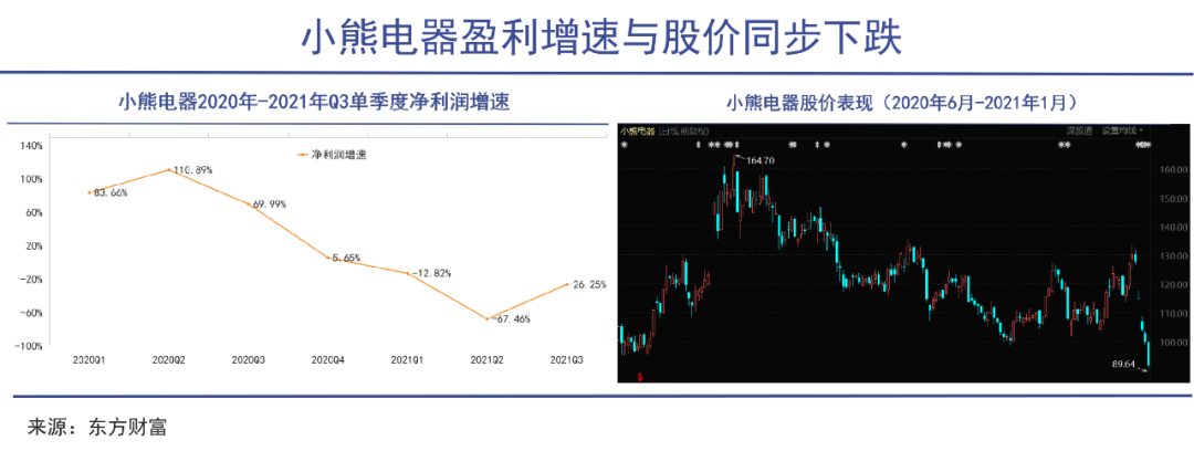 作為線上渠道為主的小家電品牌,“宅經(jīng)濟(jì)”的紅利曾經(jīng)讓小熊電器業(yè)績大爆發(fā),其股價也一度創(chuàng)下165.9元的高位,但此后小熊就迎來了利潤增速和股價的同步下挫。進(jìn)入2021年,小熊電器凈利潤在前三個季度都呈負(fù)增長。