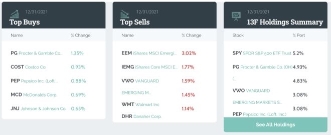 相較于2021年Q3,橋水大幅減持了新興市場(chǎng)ETF。寶潔、百事、強(qiáng)生、好市多、可口可樂(lè)和麥當(dāng)勞等美國(guó)消費(fèi)股龍頭獲得不同程度的加倉(cāng)。