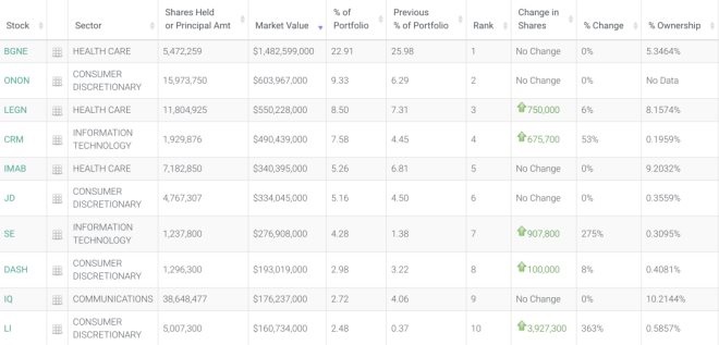 HHLR Advisors 最新的前十大重倉(cāng)股為百濟(jì)神州、On 昂跑、傳奇生物、Salesforce、天境生物、京東、SEA、DoorDash、愛(ài)奇藝和理想汽車。