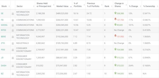 增持幅度顯著的還有“東南亞小騰訊”SEA,增持90萬(wàn)股至123.78萬(wàn)股。SEA新晉為HHLR第七大重倉(cāng)股。