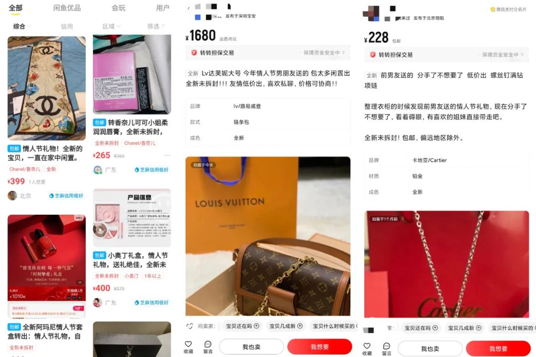驚蟄研究所觀察到,雖然情人節(jié)剛剛過去兩天,但在閑魚和轉轉等二手交易平臺上,可以看到有不少平臺用戶發(fā)布了轉售情人節(jié)禮物的信息,轉售的禮物包括各種奢侈品品牌的珠寶首飾、香水、包袋和護膚品等。