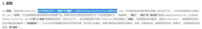變化的跡象最先發(fā)生在「SHEIN」領(lǐng)英頁面上,其公司簡介已更改新加坡為總部。而「SHEIN」網(wǎng)站的法律條款頁面也顯示,一家名為「Roadget Business Pte. LTD.」的新加坡公司已經(jīng)是「SHEIN」 APP和網(wǎng)站的運(yùn)營主體,面向消費(fèi)者銷售產(chǎn)品。
