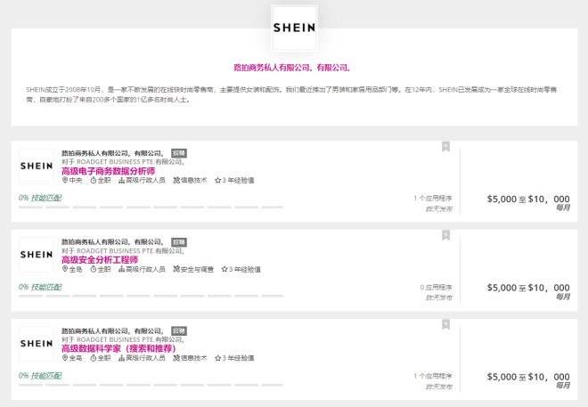 與此同時(shí),「SHEIN」正積極擴(kuò)大新加坡的團(tuán)隊(duì)規(guī)模,在新加坡官方就業(yè)網(wǎng)站「MyCareersFuture」上,「SHEIN」已經(jīng)密集上線15個(gè)初高級(jí)崗位。值得注意的是,幾乎所有公開崗位均是與「SHEIN」核心競爭力密切相關(guān)的數(shù)據(jù)工程師或分析師,僅有一個(gè)高級(jí)社交媒體營銷專家崗位。