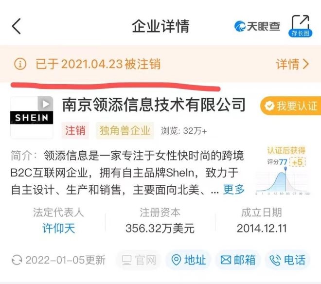 天眼查數(shù)據(jù)顯示,曾是「SHEIN」國內(nèi)主體公司的“南京領(lǐng)添信息技術(shù)有限公司”已于去年4月23日注銷營業(yè)執(zhí)照。進(jìn)一步穿透其股權(quán)結(jié)構(gòu),許仰天本人也不再擔(dān)任國內(nèi)任何公司的法人。所以基于多方信息來看,不排除「SHEIN」要將公司核心力量乃至總部遷移到新加坡的可能。