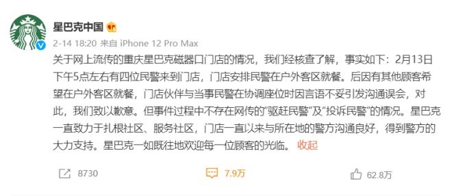 14日,星巴克客服人員率先回應(yīng)表示,涉事門店為磁器口后街店,已接到相關(guān)舉報(bào),正在內(nèi)部調(diào)查。同一天下午六點(diǎn),星巴克中國(guó)在其官方微博發(fā)文對(duì)該事件進(jìn)行了梳理,并表示“門店伙伴與當(dāng)事民警在協(xié)調(diào)座位時(shí)因言語(yǔ)不妥引發(fā)溝通誤會(huì)”,“不存在網(wǎng)傳的‘驅(qū)趕民警’及‘投訴民警’的情況”。
