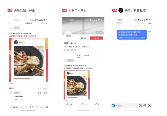 在今日頭條、抖音等生態(tài)內(nèi),有贊小程序鏈接可嵌入在頭條文章內(nèi)容、頭條文章評(píng)論區(qū)、頭條個(gè)人中心、以及頭條和抖音的私信中。在頭條、抖音的私信消息中打開(kāi)小程序推廣鏈接,還可搭配私信營(yíng)銷(xiāo),自動(dòng)回復(fù)等工具使用,提升營(yíng)銷(xiāo)效率。