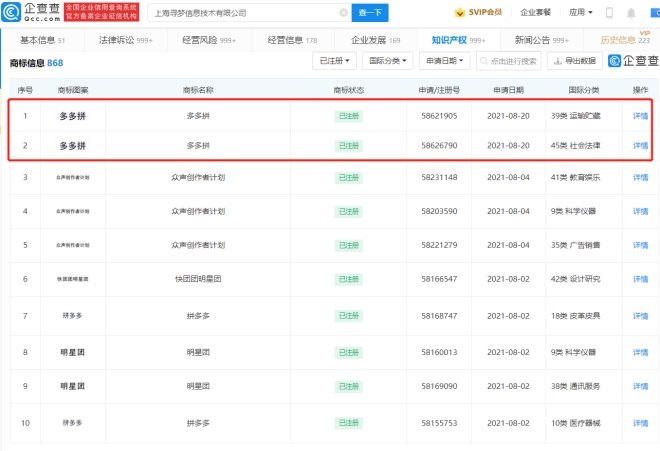 2月17日消息,企查查信息顯示,近日,拼多多關(guān)聯(lián)公司上海尋夢(mèng)信息技術(shù)有限公司“多多拼”商標(biāo)申請(qǐng)成功,商標(biāo)國(guó)際分類(lèi)涉運(yùn)輸貯藏、社會(huì)法律。此前,該公司已成功注冊(cè)多個(gè)“拼多多”商標(biāo)。