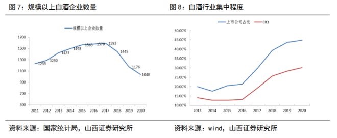 其實,隨著白酒產(chǎn)量見頂并下滑,從2016 年的1358 萬千升下降到2020 年的741萬千升,“馬太效應”愈發(fā)明顯。據(jù)國家統(tǒng)計局數(shù)據(jù),2020年全國規(guī)模以上白酒企業(yè)1040 家,比2019年減少58家,已連續(xù)三年下滑。