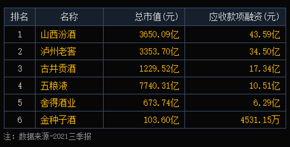 而且,數(shù)據(jù)顯示,截至2021年第三季度末,山西汾酒的應收賬款融資高達43.59億元,同比增幅超過49%,而且這一數(shù)據(jù)位居行業(yè)首位,超出第二名瀘州老窖近10億元。