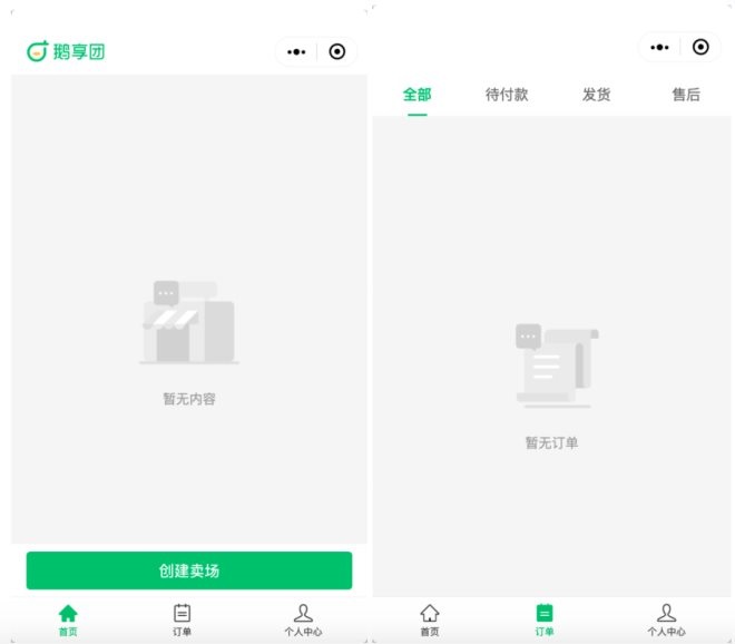 在鵝享團的首頁,團長需要創(chuàng)建一個“賣場”,賣場內(nèi)陳列著團長的商品。團長可以將商品分享到微信群和微信好友內(nèi),當(dāng)有用戶購買商品后,團長會在后臺收到訂單信息,然后由團長開始發(fā)貨,發(fā)出的商品信息會在展示在“訂單”中。此外,團長還可以在“訂單”頁面查看商品付款狀態(tài)以及售后情況。