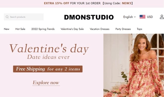 這個(gè)上線又關(guān)閉的快時(shí)尚獨(dú)立站Dmonstudio,整體風(fēng)格樣式和SHEIN非常類似,加粗黑體Logo,導(dǎo)航欄,封面圖片及活動(dòng)主題等。其介紹內(nèi)容也是服務(wù)于100多個(gè)國(guó)家,專注女性時(shí)尚服裝和配飾。