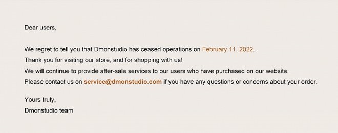 根據(jù)Dmonstudio官網(wǎng)發(fā)布的網(wǎng)站運(yùn)營(yíng)關(guān)停公告可以看到,其具體關(guān)閉日期是2022年2月11日,不過(guò)并未就關(guān)停原因作出解釋,但表示會(huì)為消費(fèi)者在網(wǎng)站上購(gòu)買(mǎi)的產(chǎn)品繼續(xù)提供售后服務(wù)。