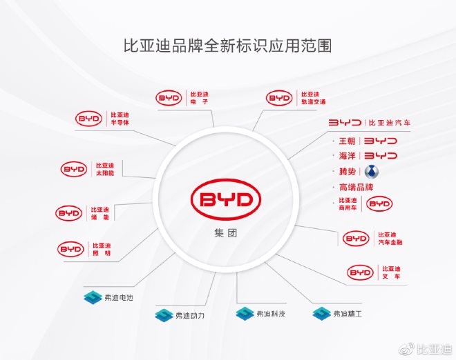 據(jù)悉,比亞迪集團(tuán)新標(biāo)識,將在旗下電子、新能源、軌道交通以及汽車產(chǎn)業(yè)中使用,與此同時,汽車產(chǎn)業(yè)的乘用車板塊各品牌將使用各自的品牌標(biāo)識。
