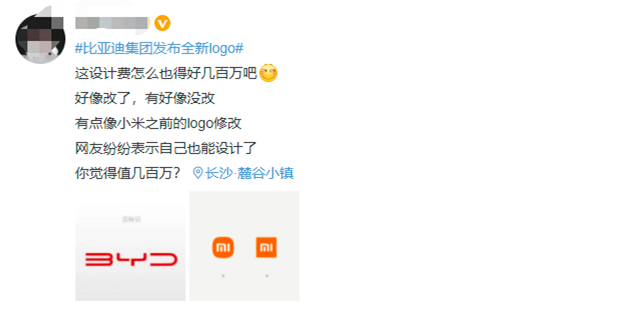 不過,在看到比亞迪新logo時,不少網(wǎng)友表示想到了之前小米換的新logo。網(wǎng)友調(diào)侃,這設(shè)計(jì)費(fèi)怎么也得好幾百萬吧,好像改了,又好像沒改,有點(diǎn)像小米之前的logo修改。也有人發(fā)問,和小米是同一個設(shè)計(jì)師嗎?