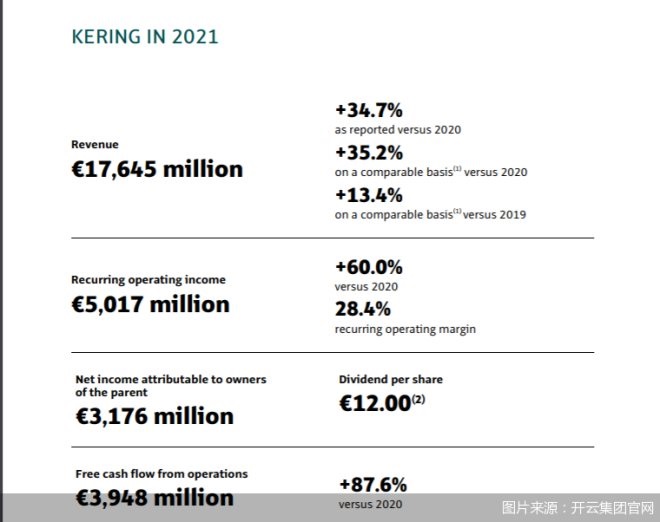 2月18日,北京商報記者了解到,截至2021年12月31日,法國奢侈品巨頭Kering(以下簡稱“開云集團”)全年銷售額達到176.45億歐元,同比增長34.7%,相比2019年同期增長13%。其中,第四季度銷售額 54.1億歐元,同比增長32%。