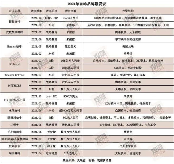 還可以明顯看到,2020年,資本對(duì)咖啡市場(chǎng)的關(guān)注度主要集中在線上品牌;2021年則是集中在線下連鎖精品咖啡。