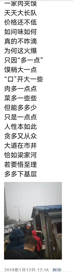 這家“肉夾饃攤位”可以說是這個早市最大、也是最持久的“網(wǎng)紅”了,最初引起我注意是因為“它那天天排大長隊”,不僅周末排、工作日也排,可以說是“一直排”。人都是遵循從眾效應(yīng)的,所以一天我也排隊購買了一次,結(jié)果還真發(fā)現(xiàn)了他們的“門道”,當(dāng)時還有感而發(fā)、特地“賦詩一首”——