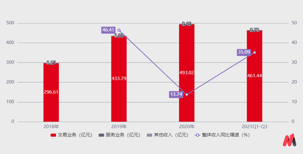 分業(yè)務看,交易業(yè)務是匯通達主要收入來源。2018年、2019年、2020年以及2021年前三季度,匯通達的交易業(yè)務收入分別為296.606億元、433.786億元、493.02億元和461.435億元,貢獻收入比均在99%以上。反觀匯通達的服務業(yè)務,即通過給小企業(yè)提供SaaS以及解決方案,收入占比不足1%。