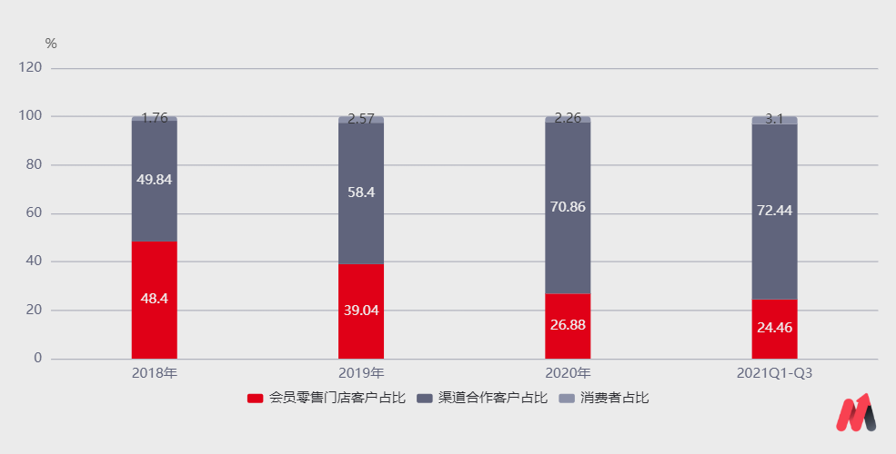 匯通達的客戶包括會員零售門店、渠道合作客戶(經(jīng)銷商)以及消費者。令投資者擔憂的是,匯通達聚焦的會員零售門店客戶貢獻的收入在逐漸下降,從2018年的48.4%持續(xù)下滑至2021年前三季度的24.46%。