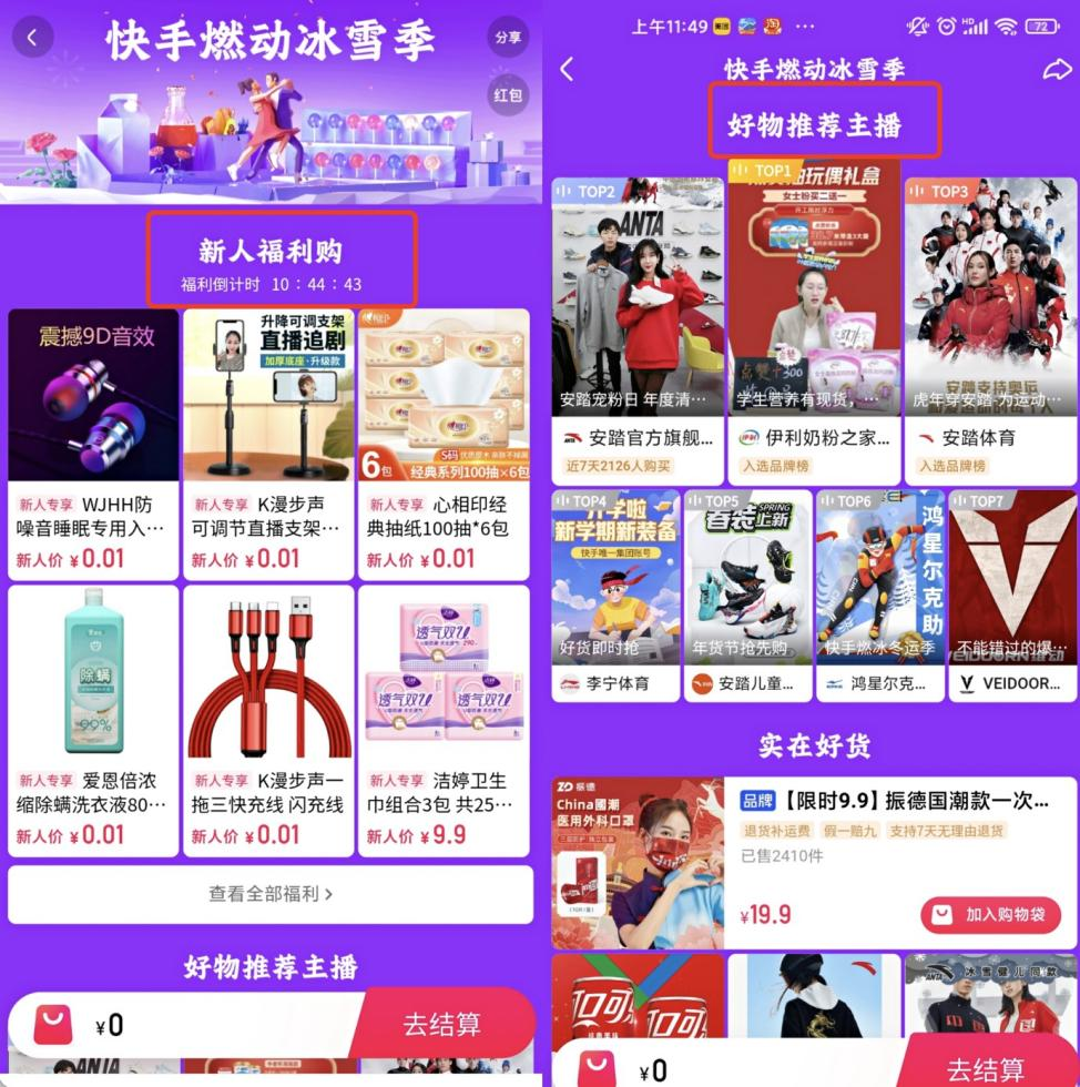 其次,從快手冬奧專區(qū)的“冰雪好貨”里可以看到,“拉新”意圖明顯。在下滑區(qū)間中,“0.01元的新人福利購”占據(jù)在最上方版面,下一頁才是“好物推薦主播”,包括安踏、李寧、鴻星爾克、伊利等在內(nèi)的品牌正在直播。