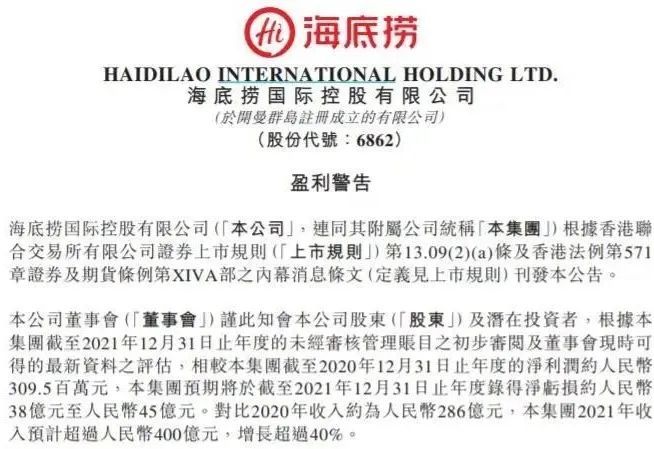 2月21日,海底撈發(fā)布了一份盈利警告——預(yù)期將于截至2021年12月31日止年度錄得凈虧損約人民幣38億元至人民幣45億元。對比2020年收入約為人民幣286億元,集團2021年收入預(yù)計超過人民幣400億元,增長超過40%。