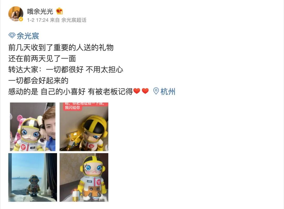 雙十一之后不久,雪梨即因偷逃稅事件被封禁直播間,并長(zhǎng)時(shí)間沒(méi)有消息。然而,今年1月2日,光光發(fā)了一條意味深長(zhǎng)的微博,表示“前幾天收到了重要的人送的禮物(泡泡瑪特公仔),還在前兩天見(jiàn)了一面。轉(zhuǎn)達(dá)大家:一切都很好,不用太擔(dān)心,一切都會(huì)好起來(lái)的。感動(dòng)的是,自己的小喜好,有被老板記得”。