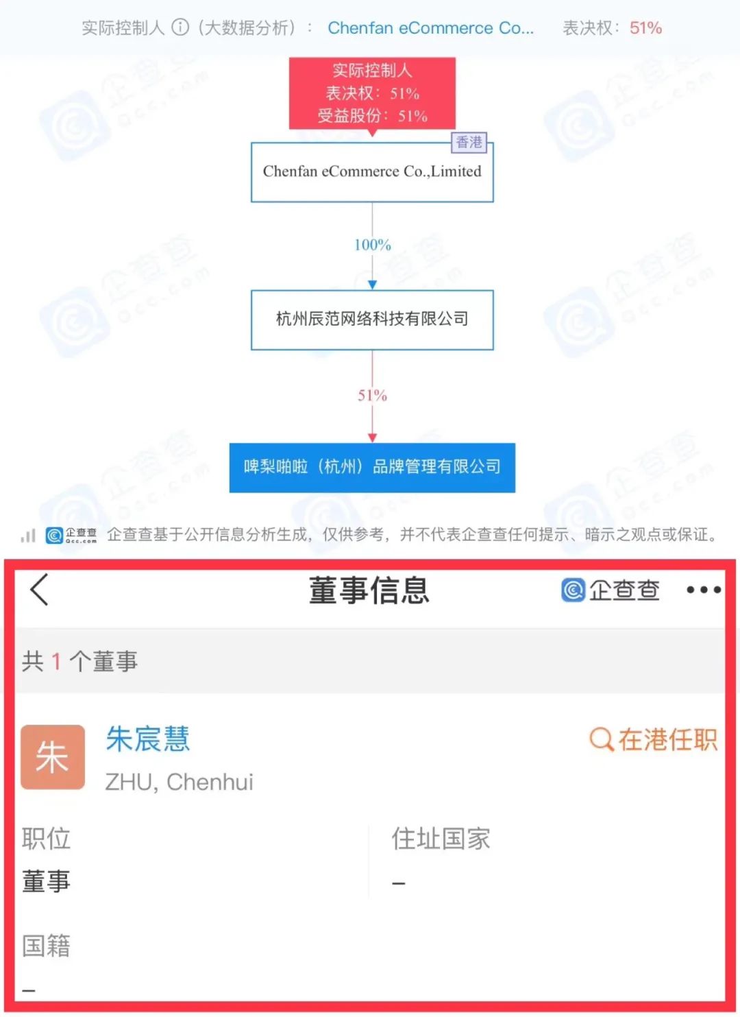 啤梨啪啦的實(shí)控人為雪梨擔(dān)任董事的香港注冊(cè)企業(yè)