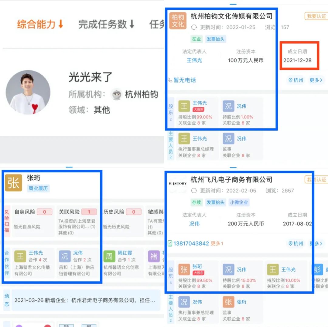 光光來(lái)了直播間所屬機(jī)構(gòu)為杭州柏鈞文化傳媒有限公司,王偉光為公司法定代表人,持股比例達(dá)99%。另一股東為況偉,持股比例為1%。