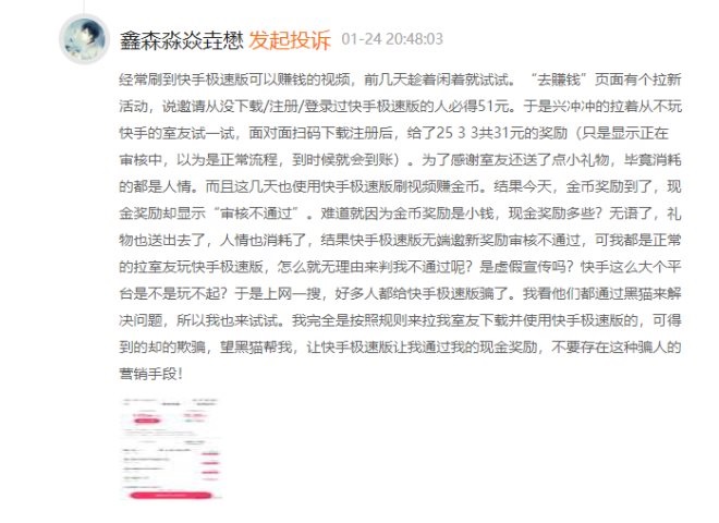 “經(jīng)常刷到快手極速版可以賺錢視頻,說邀請從沒下載/注冊/登錄過快手極速版的人必得51元。于是拉著從不玩快手的室友試一試,面對面掃碼下載注冊后,給了共31元的獎勵(顯示在審核中)。此后幾天也使用快手極速版刷視頻賺金幣。結(jié)果金幣獎勵到了,現(xiàn)金獎勵卻顯示‘審核不通過’。上網(wǎng)一搜,好多人都是類似情況!1月24日,用戶“鑫森淼焱垚懋”就投訴稱。截至發(fā)稿,盡管該用戶多次補(bǔ)充投訴,但快手官方并未對上述投訴給出具體回復(fù)。