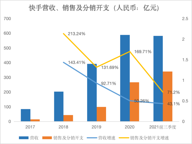 這背后,是從快手花錢效率高于收錢效率。根據(jù)大數(shù)據(jù)公司“DataEye”統(tǒng)計,2020年快手銷售及分銷開支高達(dá)266.1億元,同比增長近170%,換來營收僅增長50%。2021年前三季度,銷售及分銷開支高達(dá)339億,同比增長71%,換來營收僅增長43%。