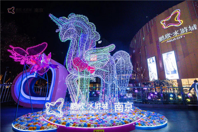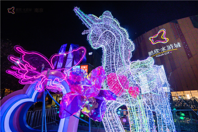 商場大門的巨型“獨(dú)角獸”造型,以五彩仿真花和粉藍(lán)相間的心型為造型,構(gòu)筑出暖心又奇特的歡樂世界。夜晚,當(dāng)燈光亮起,置身繽紛的奇趣花海中,釋放出無拘無束的輕松氛圍和歡樂能量。