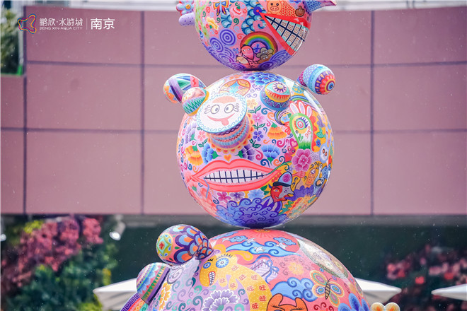 此次南京水游城聯(lián)手中國臺灣新銳藝術(shù)家洪易打造的藝術(shù)美陳,正是基于上述理念的一次呈現(xiàn)。結(jié)合在地屬性的元素、色彩、圖像及寓意,打造了金錢蛙、財(cái)貓、豬福年年三個IP形象,構(gòu)建出鮮明的特色意像。深入分析后,有以下三個特征值得行業(yè)借鑒。